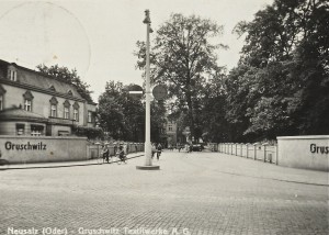 (158-159) Entrance to the Gruschwitz textile factory complex, just a few thousand feet from the Jewish slave labor camp (Neusalz, early 1940s). For image credit, see below.