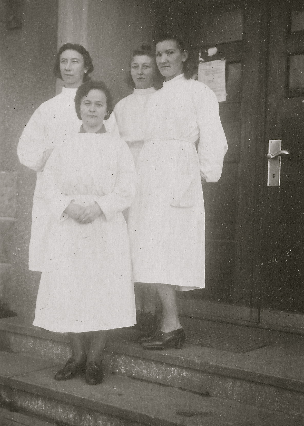 (246) Jadzia (far left) with nurses in front of camp “Burg” infirmary, in her first job as a refugee physician (Darmstadt, 1945).