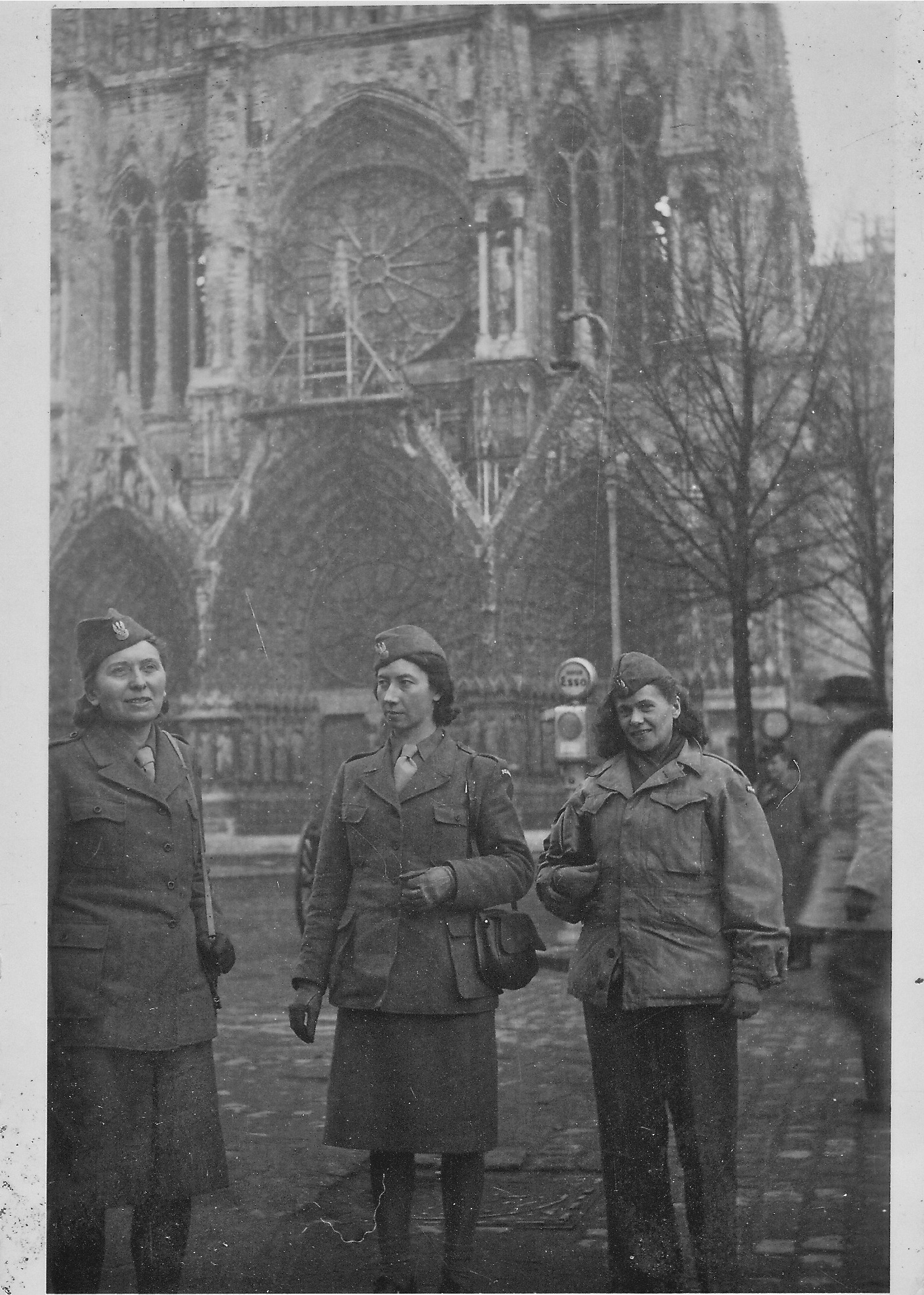Left: Lola Krzeminska, Jadzia, and fellow traveler (left to right) in front of the cathedral in Reims.