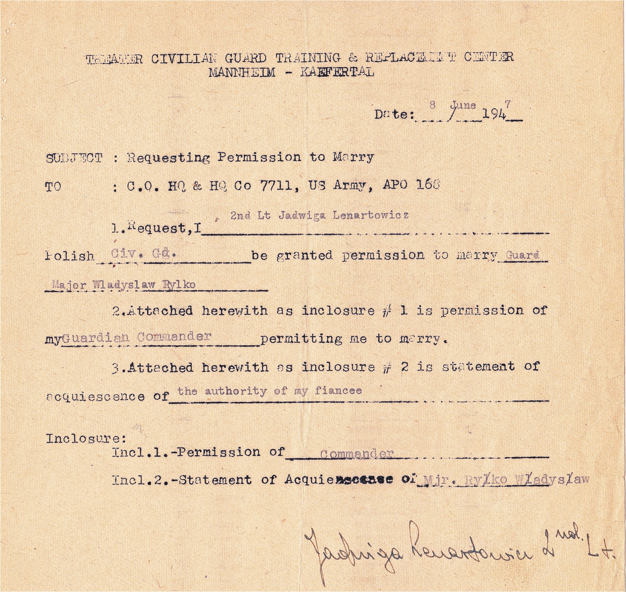 (264) Official request for permission to marry, submitted by Jadzia to her commanding officer in the U.S. Military Labor Service (June 8, 1947).