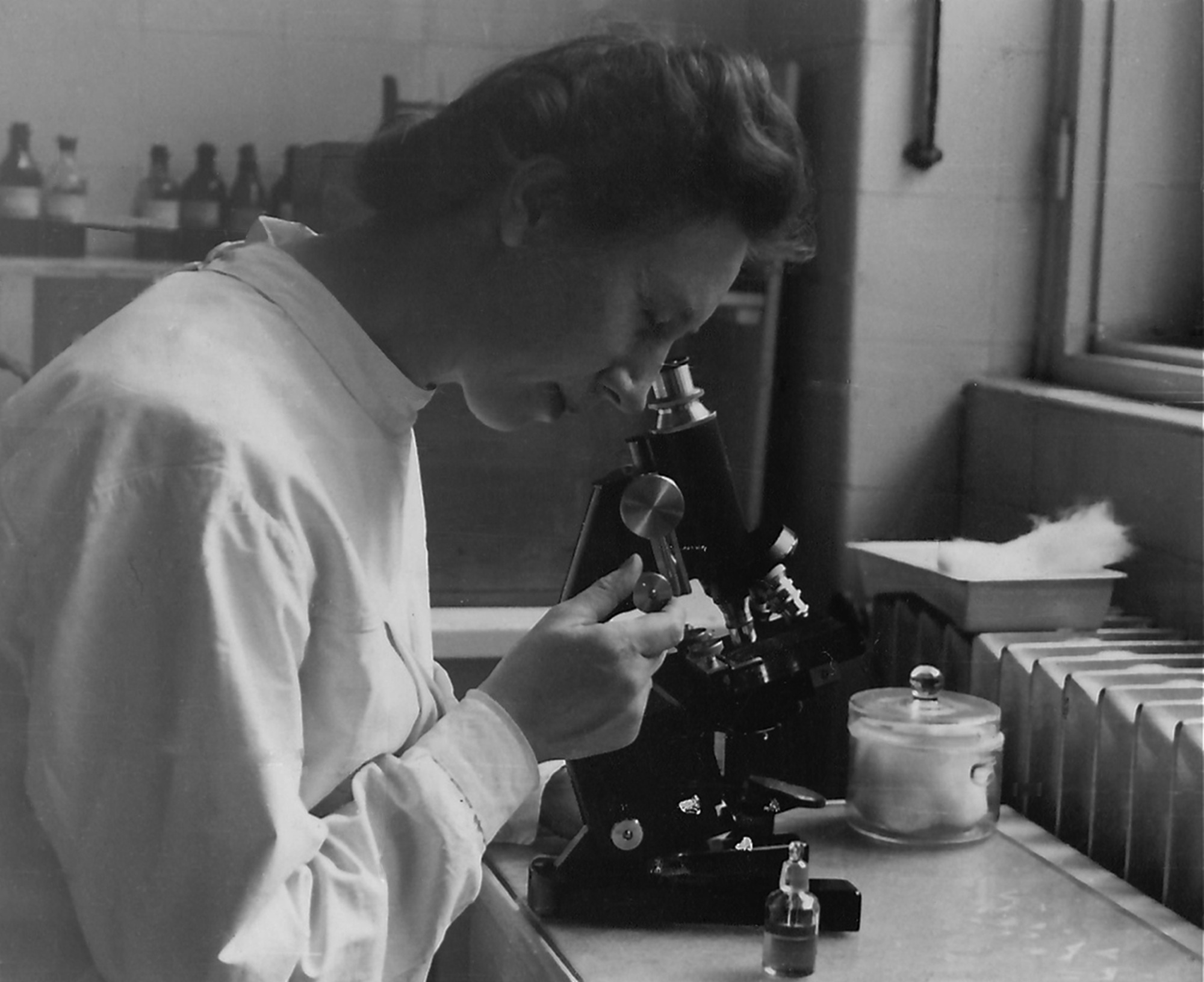 (277-278) Jadzia at the microscope in the Polish dispensary (Höchst, 1949).