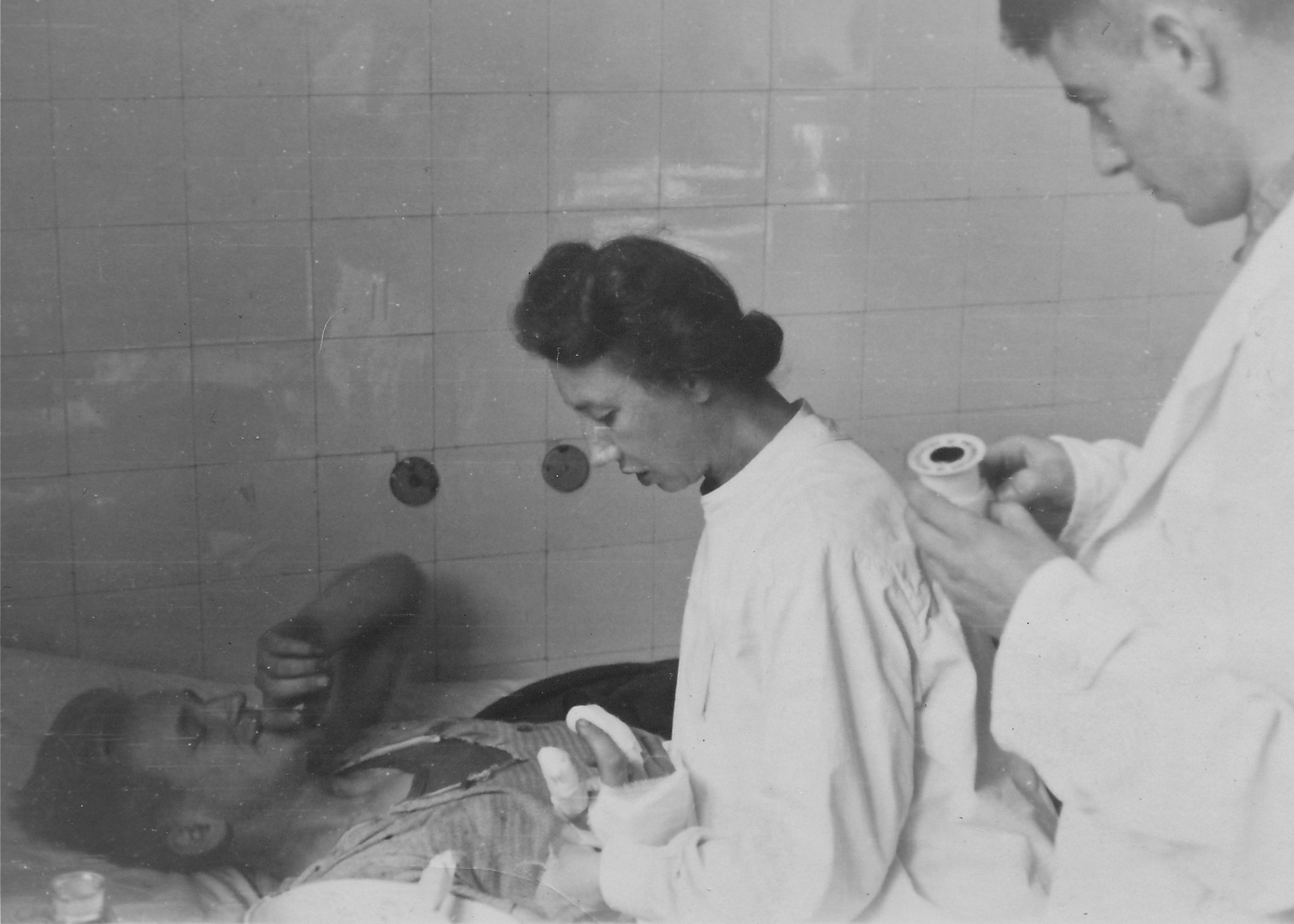 (279) Jadzia treating a patient at the Polish dispensary, assisted by a medical student (Höchst, 1949).