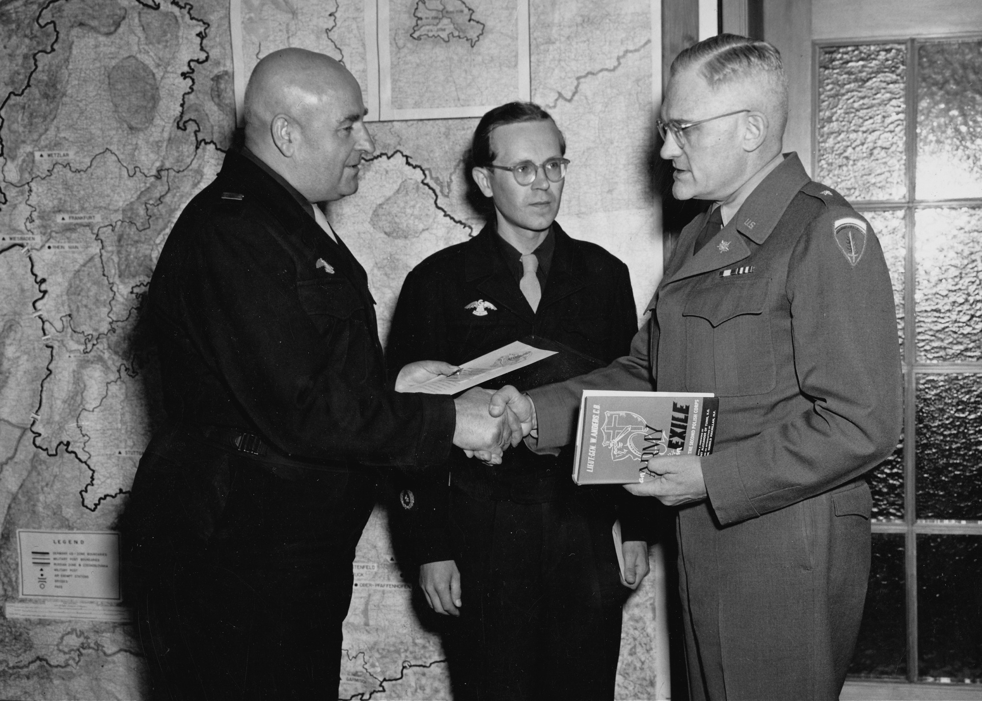 (276) “Guard Major Wladyslaw Rylko, Deputy Liaison Director of the Polish Labor Service Companies, EUCOM, presents a copy of the book, “An Army in Exile,” to Brigadier General Williston B. Palmer, Acting Chief of Staff, EUCOM” (Official text from back of photo, Heidelberg, 1949).